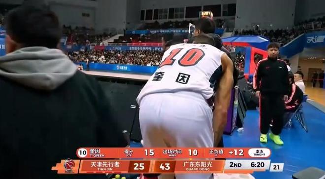 但接下來(lái)的7分04秒,奎因在打進(jìn)一次暴扣后的防守回合腳底打滑拉傷大腿,被迫提前下場(chǎng)。