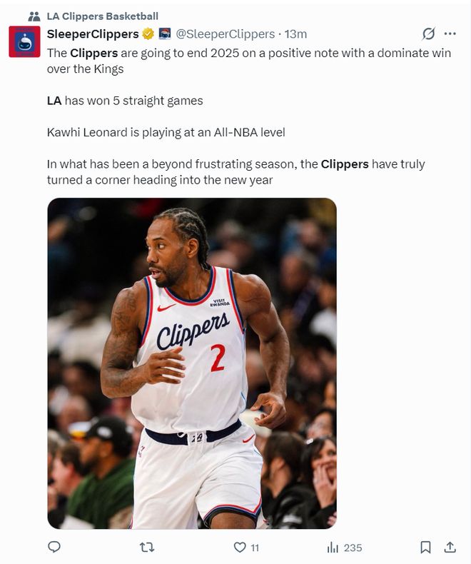 - 2025年12月31日 快船41分大勝國王迎5連勝 小卡33+5+5 哈登21+5 威少12分