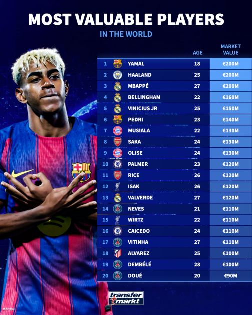 周五,《轉會市場》公布2025年球員身價百強排行榜,18歲的亞馬爾排名榜首,力壓身價同樣為2億歐元的哈蘭德、姆巴佩。