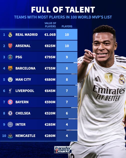 皇馬有10名球員躋身前100位,這讓皇馬排名所有球隊之首,其次分別是巴黎圣日耳曼(9人)、巴薩(8人)、曼城(8人)、利物浦(7人)、拜仁(7人)、切爾西(6人)。