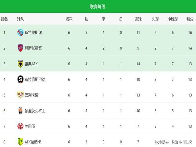 聯(lián)賽階段所有比賽結(jié)束后,斯特拉斯堡5勝1平,無(wú)可爭(zhēng)議地拿下第一名,這支被戲稱為切爾西二隊(duì)的法甲勁旅,本賽季表現(xiàn)相當(dāng)出色,目標(biāo)顯然是劍指冠軍。西甲的巴列卡諾,以及德甲的美因茨,末輪雙雙獲勝,成功保住前八名,可以直接晉級(jí)16強(qiáng)。