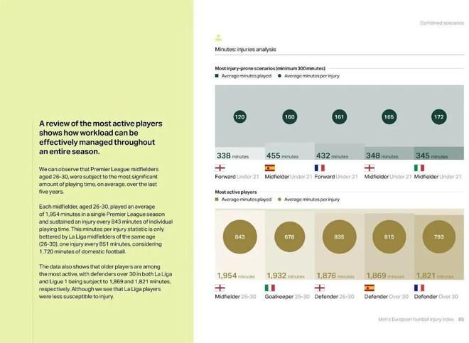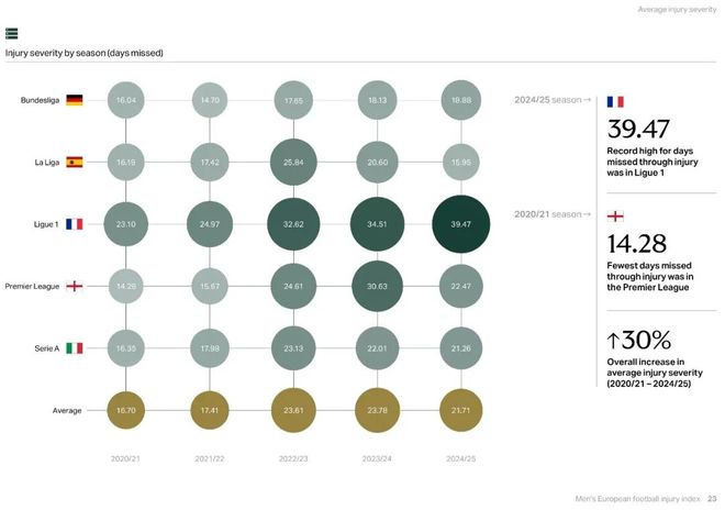 豪頓報告顯示過去的5個賽季,五大聯(lián)賽單賽季平均傷病時間普遍增長。法甲從23.1天飆升到39.47天,形勢最嚴(yán)峻。英超從14.28天增至22.47天,2023/24賽季峰值也達(dá)到30.63天。究其根源,近5個賽季愈發(fā)緊密的賽程和不斷增加的比賽是主因。曾與曼聯(lián)和紅牛集團(tuán)合作過的精英運動員傷病風(fēng)險專家索普表示:“大賽后的傷病激增符合邏輯,參加國際大賽的球員都是高薪精英球員,他們的傷病會造成俱樂部成績和經(jīng)濟(jì)的巨大損失。”