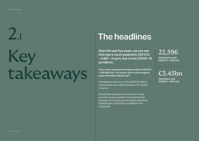 12月16日,英國豪頓保險公司發(fā)布了《2024/25賽季歐洲足球傷病報告》。這份厚達(dá)286頁的報告披露了震驚世界的五大聯(lián)賽“傷病成本”金額:最近5個賽季,五大聯(lián)賽共出現(xiàn)22596人次傷病,俱樂部的“傷病成本”達(dá)34.46億歐元。英超俱樂部傷病次數(shù)占24%,“傷病成本”(13.79億歐元)占比高達(dá)40%,金額超過排名其后的西甲(6.01億)和德甲(5.80億)總和。