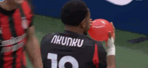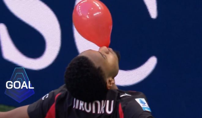 打入意甲處子球之后,米蘭球員將恩昆庫(kù)圍起來不斷拍打其頭部,隨后,恩昆庫(kù)吹起了紅色氣球,慶祝自己的意甲處子球。