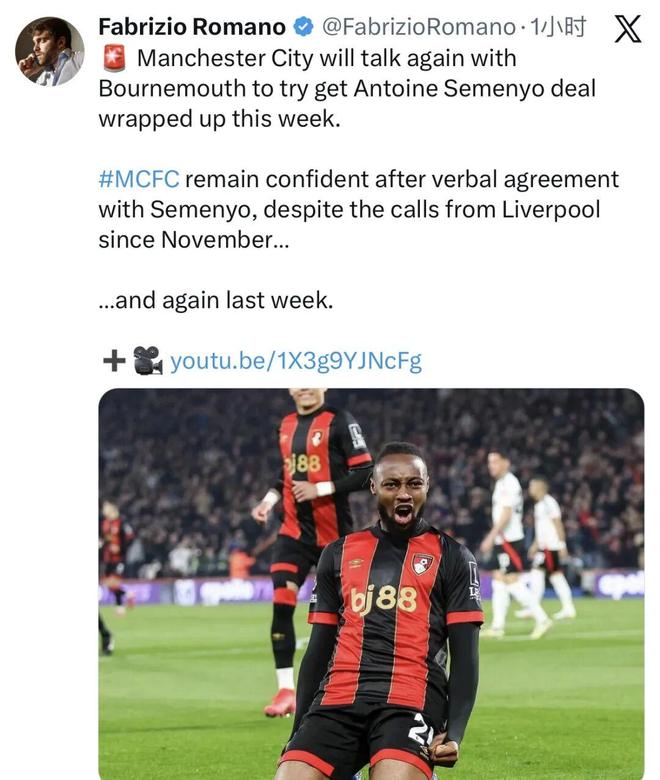 據(jù)名記羅馬諾的最新消息,曼城將再次與伯恩茅斯談判,力爭(zhēng)在本周敲定塞梅尼奧交易。