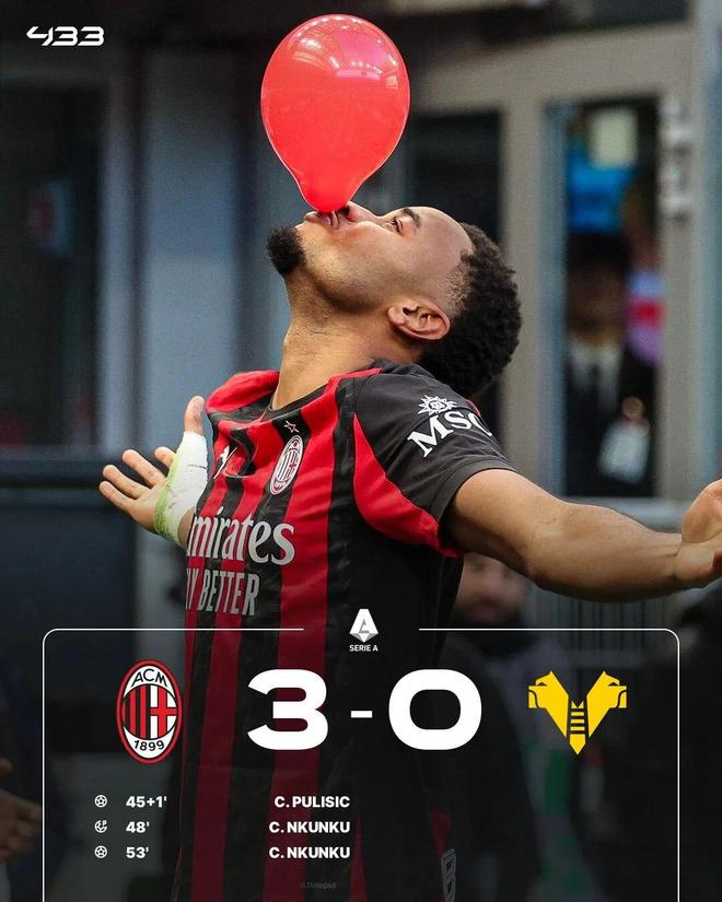 易邊再戰(zhàn),恩昆庫(kù)開場(chǎng)后造點(diǎn)并主罰命中打入個(gè)人意甲首球,隨后又補(bǔ)射空門完成梅開二度。最終,米蘭3-0戰(zhàn)勝維羅納。