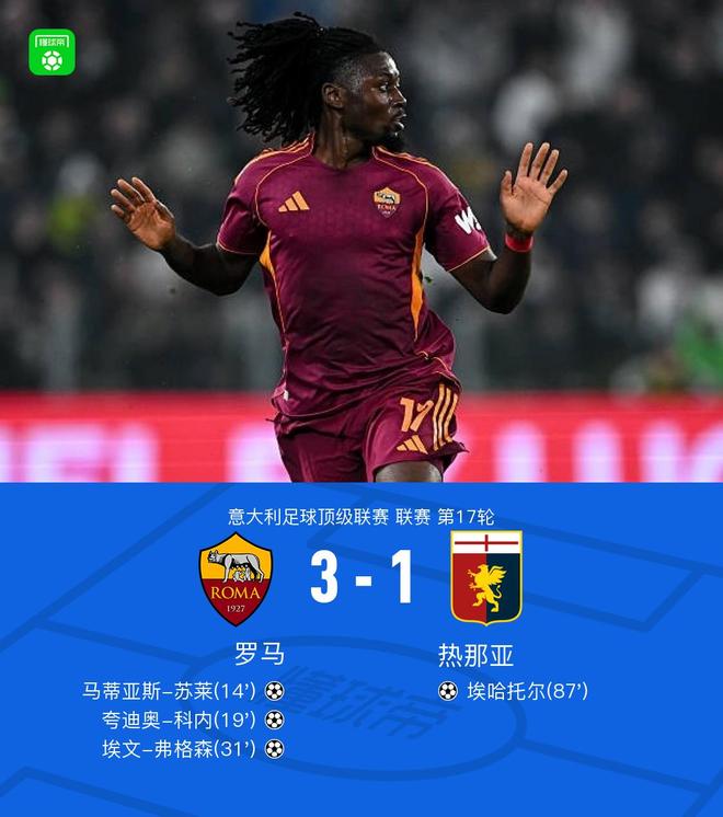 北京時(shí)間12月30日,意大利足球頂級聯(lián)賽第17輪,羅馬坐鎮(zhèn)主場迎戰(zhàn)熱那亞。比賽中,馬蒂亞斯-蘇萊率先打破僵局,為羅馬取得領(lǐng)先。隨后埃文-弗格森送出助攻,幫助夸迪奧-科內(nèi)破門擴(kuò)大比分。不久之后,埃文-弗格森接應(yīng)進(jìn)攻再度建功,將優(yōu)勢進(jìn)一步鞏固。直至比賽末段,熱那亞由埃哈托爾攻入一球,挽回些許顏面。最終全場比賽結(jié)束,羅馬以3比1戰(zhàn)勝熱那亞。