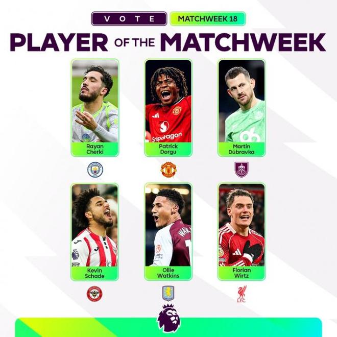 英超官方公布了英超第18輪周最佳球員候選名單,其中候選六人為謝爾基、多古、馬丁·杜布拉夫卡、凱文·沙德、沃特金斯、維爾茨。