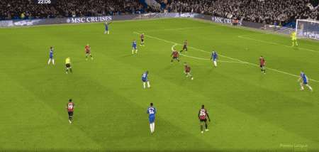 第24分鐘,切爾西前場4人組打出精彩配合,埃斯特旺策動進攻,加納喬助攻,恩佐利用重心的變化晃過防守起腳怒射,帕爾默趕緊閃躲,皮球直掛死角。