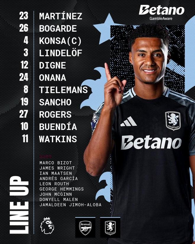 阿斯頓維拉首發(fā):23-達(dá)米安-馬丁內(nèi)斯、26-博加德、4-孔薩、3-林德洛夫、12-迪涅、24-阿馬杜-奧納納、8-蒂勒曼斯、19-桑喬、27-摩根-羅杰斯、10-布恩迪亞、11-沃特金斯