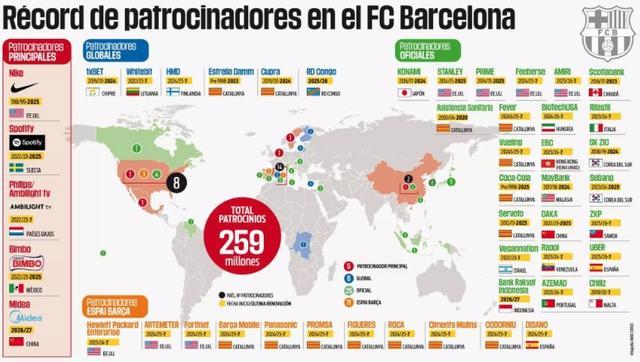 目前,巴塞羅那足球俱樂(lè)部在全球范圍內(nèi)擁有接近50家贊助商,合作伙伴遍布五大洲,展現(xiàn)出在地理分布上持續(xù)且均衡的國(guó)際化擴(kuò)張。美洲市場(chǎng)中,合作伙伴包括來(lái)自墨西哥的賓堡、加拿大的豐業(yè)銀行以及委內(nèi)瑞拉的拉皮,美國(guó)則集中了多達(dá)12家不同贊助商,成為俱樂(lè)部在該領(lǐng)域的關(guān)鍵市場(chǎng)之一。