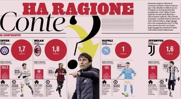 不過在本輪聯(lián)賽的賽后發(fā)布會上,當記者問到為什么那不勒斯無法真正掌控比賽時,孔蒂回答道:原因有很多。這是一條剛剛開始道路,從整體結(jié)構(gòu)層面來說我們還沒準備好。以我看來,尤文、國米和AC米蘭在結(jié)構(gòu)、二隊配置、薪資總額以及資產(chǎn)價值方面,都與其他球隊不同。每當不是這三支球隊中的一支奪冠,那就意味著完成了一項非凡的成就。我們試圖在球場上彌補這種差距,但必須承認,這些球隊本身就處在不同的層級。