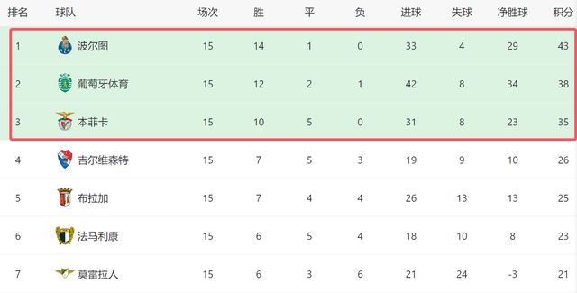 截至目前,本輪葡超的比賽已經(jīng)全部結(jié)束,加上葡萄牙體育,葡超傳統(tǒng)3強(qiáng)都拿到了3分,積分榜上的形勢(shì),也沒有發(fā)生變化。如今波爾圖依然排名第一,他們領(lǐng)先葡萄牙體育5分,而本菲卡則落后榜首8分,目前位居第三。